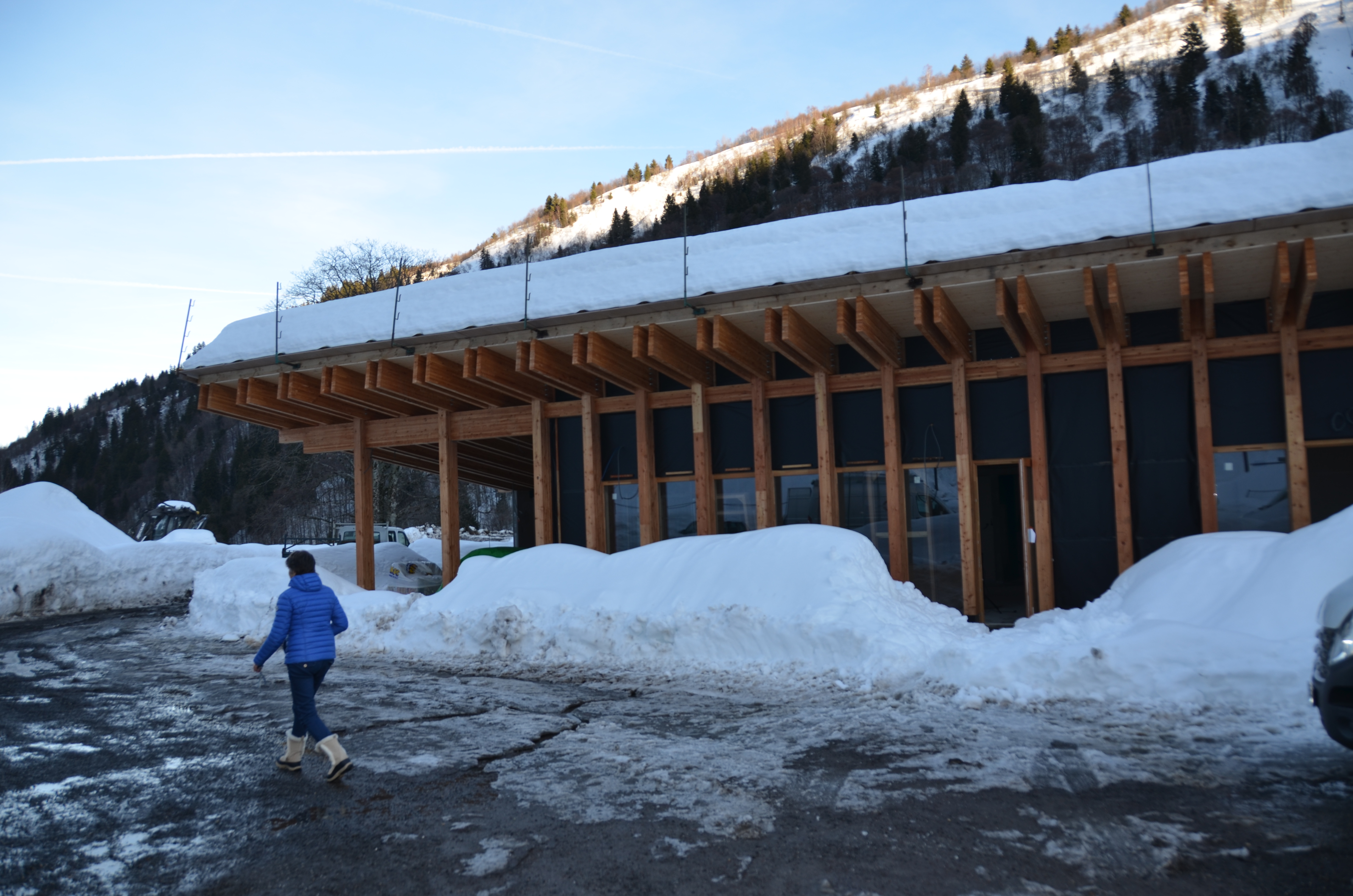 La « Maison de Celliers » vient s’implanter sur le terrain en contrebas du télécabine face au village. Elle se développe en simple rez-de-chaussée parallèle à la vallée, tout en s’ouvrant vers le village. Son large débord de toiture et ses auvents protègent les circulations vers le télécabine, la mairie et le restaurant. L’horizontale du toit domine face à la montagne, l’implantation du bâtiment crée une situation de vis-à-vis avec le village.