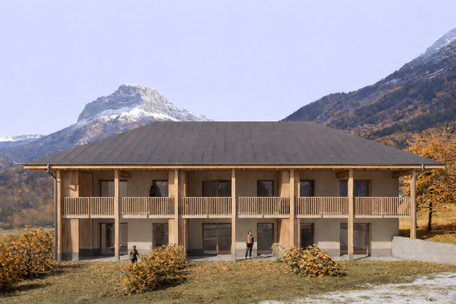 Nous avons dessiné un projet offrant aux habitants des logements traversants ouverts sur les vues de la vallée, avec de larges balcons au sud. Le projet reprend les gabarits des anciennes fermes alentour avec des matériaux naturels et bruts. Ces dispositions architecturales permettent un dialogue du bâtiment avec le patrimoine existant. L’opération atteint les standards RE2020 -10% grâce à sa compacité et sa bonne orientation.